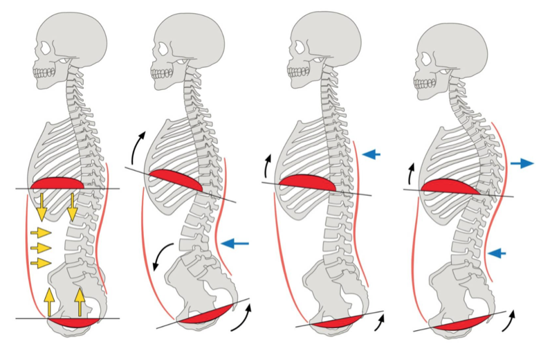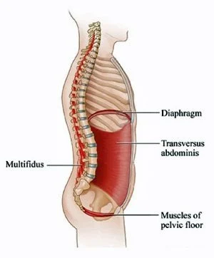 How does this happen? Well as we fill up our lungs and push down into the diaphragm into the organs and finally into the pelvic floor this creates rebound energy. Think of your core like a canister and look at the image above: the diaphragm is the top, pelvic floor is the bottom, and your abdominal and spine stabilizers make up the canister. The pelvic floor is like a trampoline and when there is pressure pushing down it then releases back up. So the diaphragm and pelvic floor work as a piston, moving up and down together.